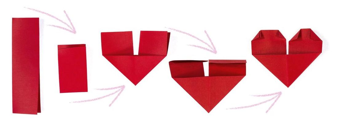 5. Knicke jetzt die vier Ecken bis auf Höhe der eben gefalteten Kante. Drehe dann das Herz wieder um. Fertig!