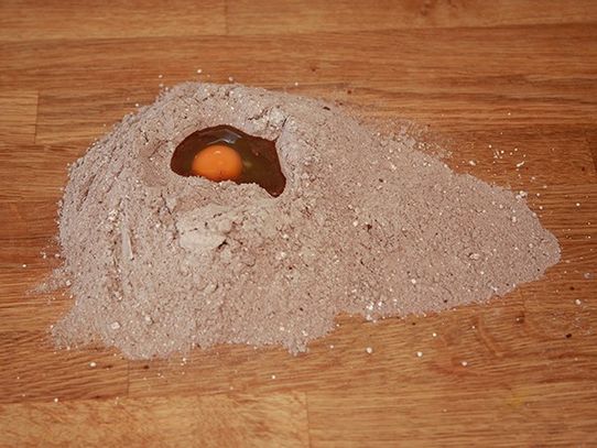 • Schütte die Mischung auf eine saubere Arbeitsfläche und drücke eine kleine Mulde in den Mehlberg hinein.