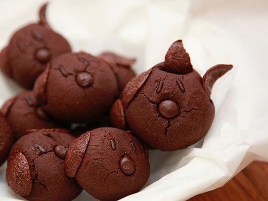 • Jetzt bekommen die kleinen Nero-Kekse Ohren, Augen und Schnauze. Drücke an jede Kugel zwei Schoko-Chips als Ohren. Dabei kann natürlich auch ein Ohr aufgestellt sein. Setze auf jede Kugel zwei Schokostreusel für die Augen und in die Mitte einen Schoko-Tropfen für die Hundeschnauze.