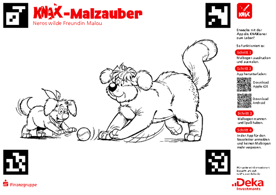 Installiere kostenlos die KNAX-Malzauber-App und scanne dann dein Bild ein. Schon erscheinen deine bunt gestalteten KNAXianer direkt in einer spannenden KNAX-Geschichte. Darin kannst du noch Aufgaben erledigen und bist selbst mittendrin in der KNAX-Welt!